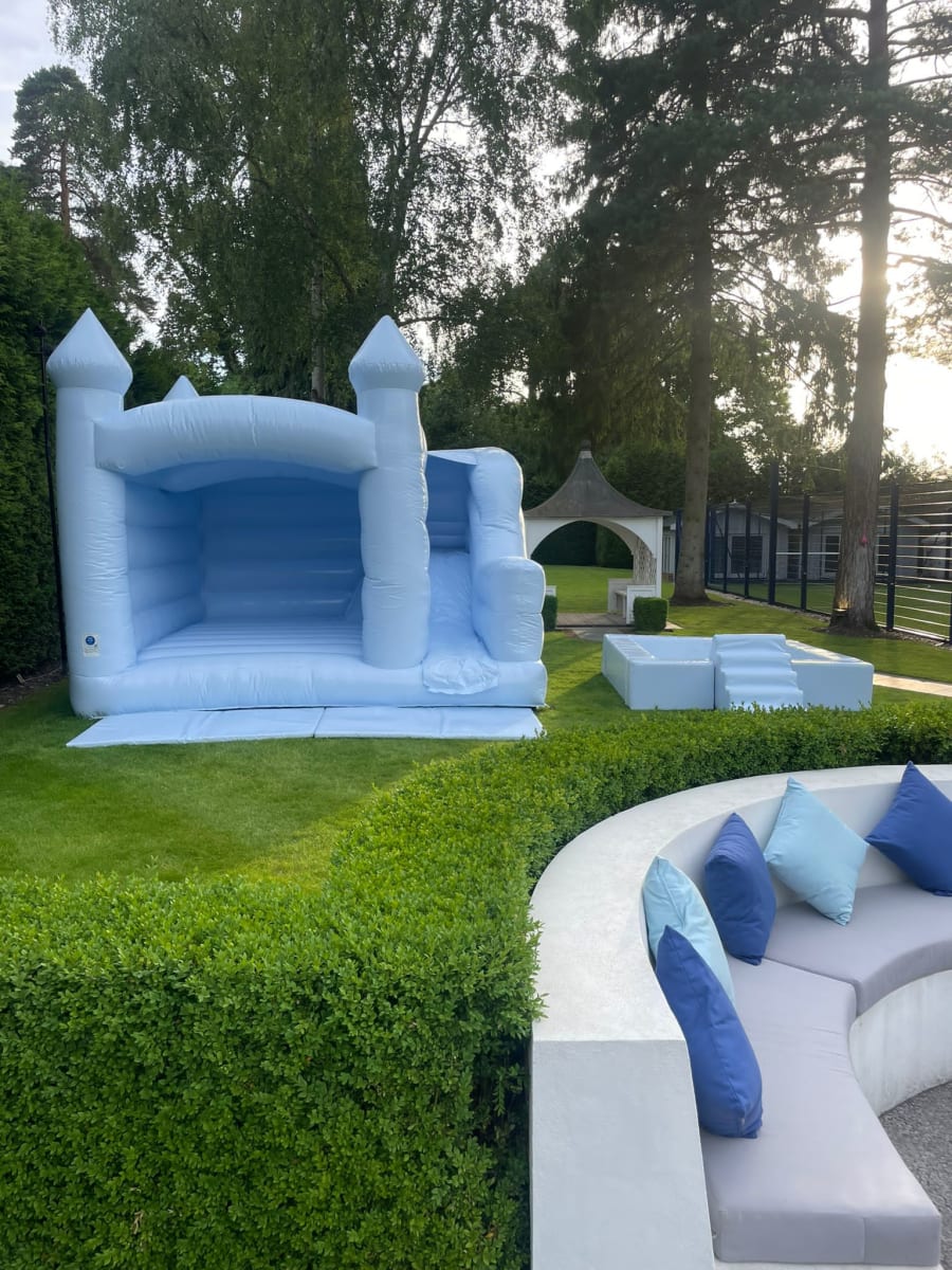 This pastel blue bouncy castle is a impressive Dimensions in ft: 14.8 x 14.8 x 12.5 (L x W x H)