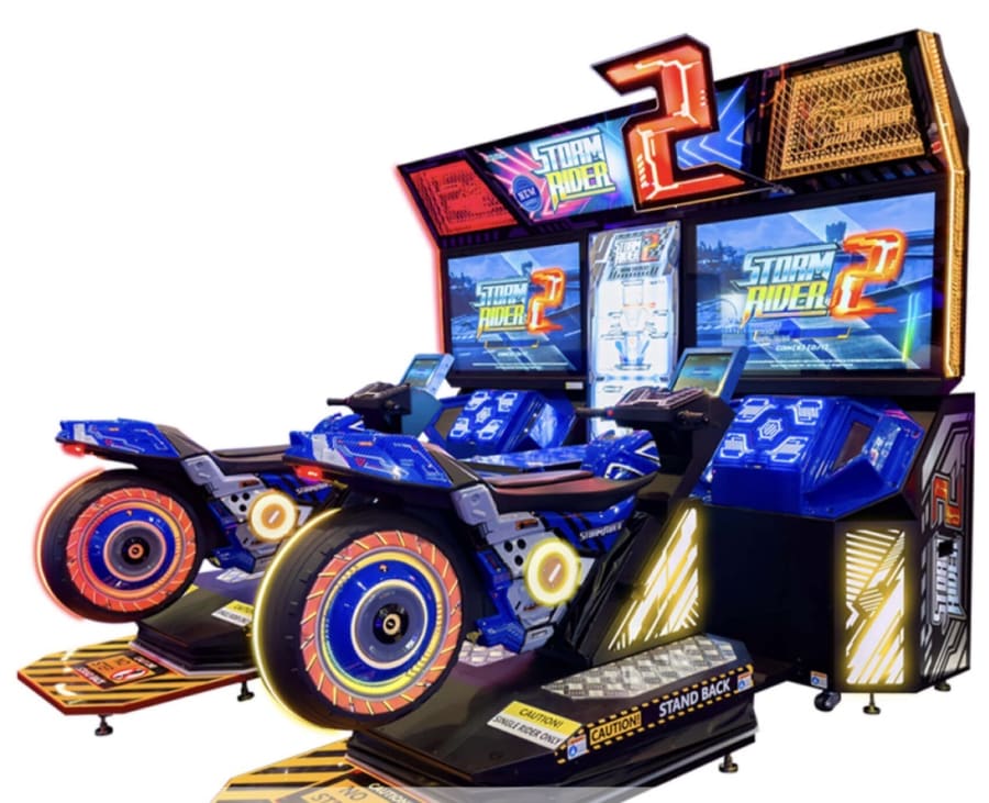 Storm Rider 2: Unlimited Boost is a high-impact twin-bike arcade racing game designed for long-term installation in leisure and entertainment venues on a revenue share basis. Featuring realistic motorbike-style controllers, bold game artwork, and dynamic cabinet lighting, it delivers an immersive racing experience that stands out on any arcade floor.