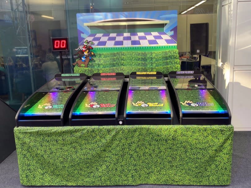 Bring the thrill of competition to your next event with our Roll and Bowl Derby Hire! This exciting four-player game is a perfect addition to indoor events of all kinds, whether it’s a corporate event, exhibition, trade show, family fun day, or another special occasion. With six different scoring holes, players compete to race their horse to the finish line by skillfully sinking balls to gain points and progress. It’s a fun and challenging activity that keeps guests of all ages entertained.